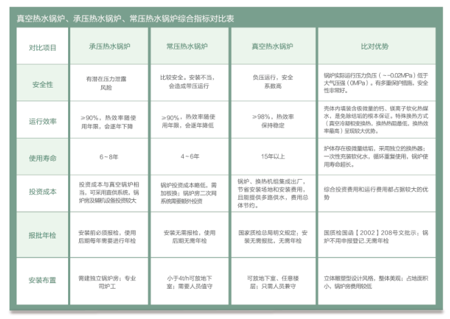真空热水锅炉、承压热水锅炉、常压热水锅炉综合指标对比表