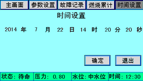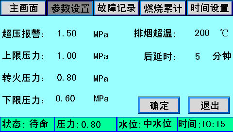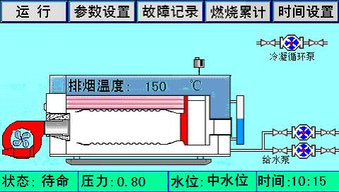 主画面上同时显示控制器状态、系统压力、水位、时间、燃烧器状态、泵状态等。