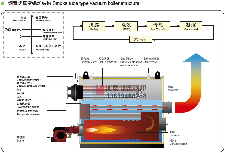 真空变相热水锅炉采用波纹炉胆、螺纹烟管、平封头管板以及自动焊接工艺,提升了锅炉的使用效率和使用寿命以及安全性能。